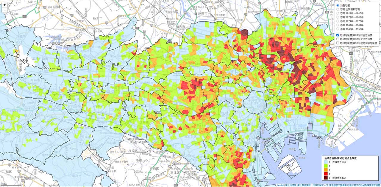 東京都では東京都震災対策条例に基づき、概ね5年ごとに地域危険度を公表しています。各地域における地震に関する危険性を、建物倒壊危険度、火災危険度、総合危険度を地図に示しています。学校周辺や自分の住む地域の危険度を見てみましょう。