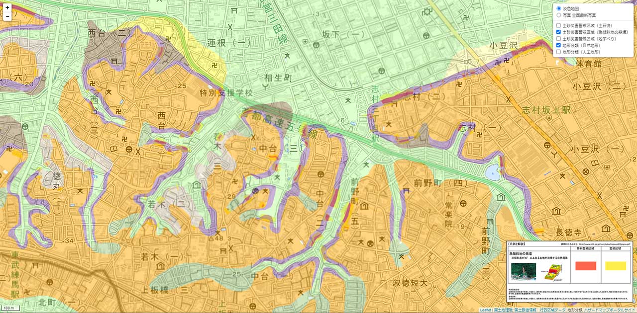 都市部にも土砂災害警戒区域があります。土砂災害警戒区域と地形との関係を調べてみましょう。
